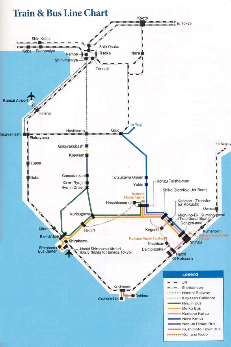 The Nakahechi route starts from Tanabe on the western coast of the Kii Penninsular and traverses east into the mountains towards the Kumano Grand Shrines. It is the most popular route.