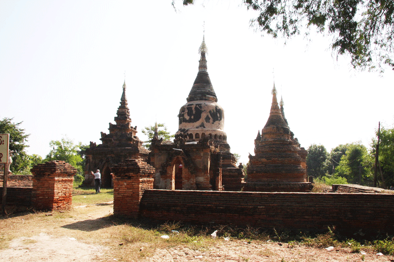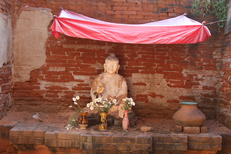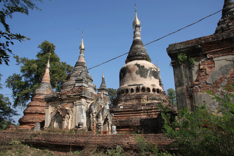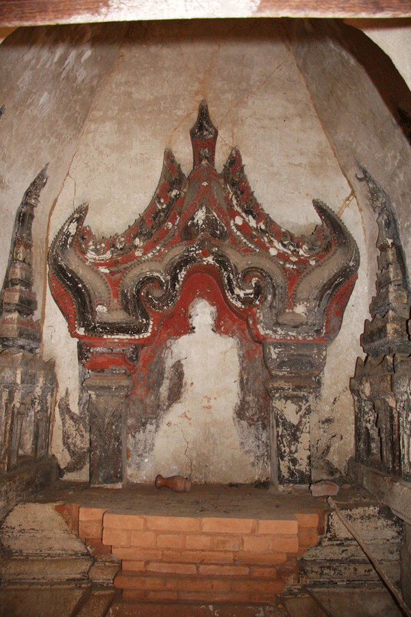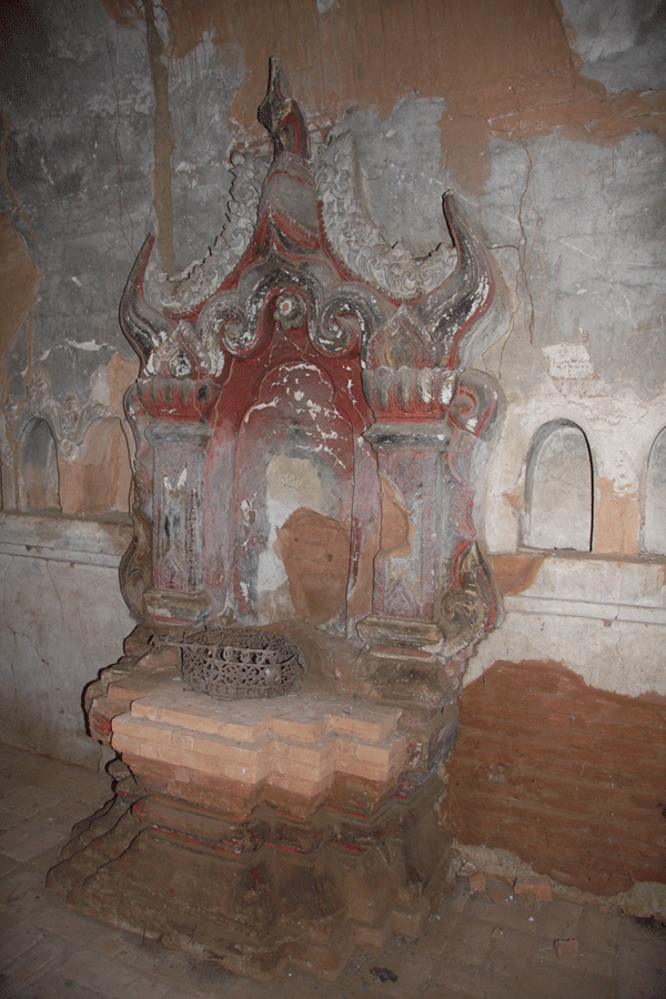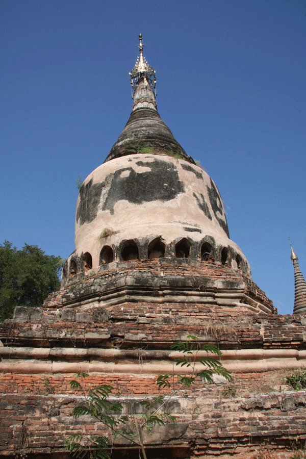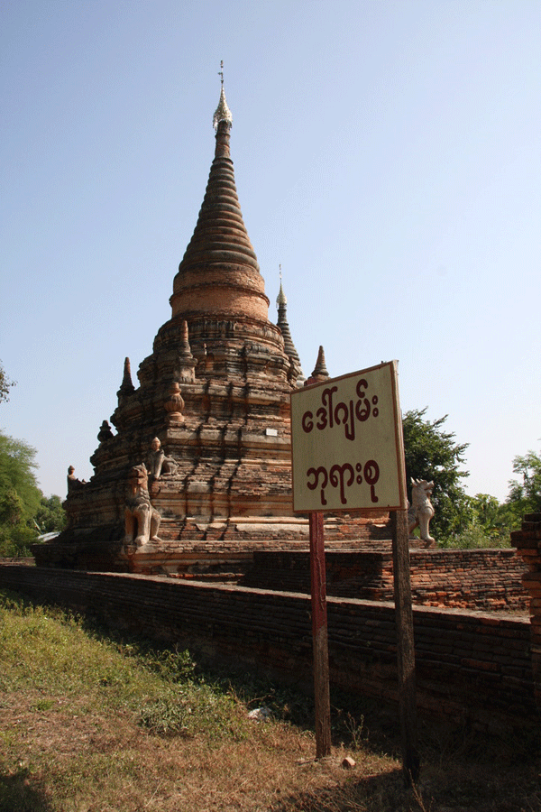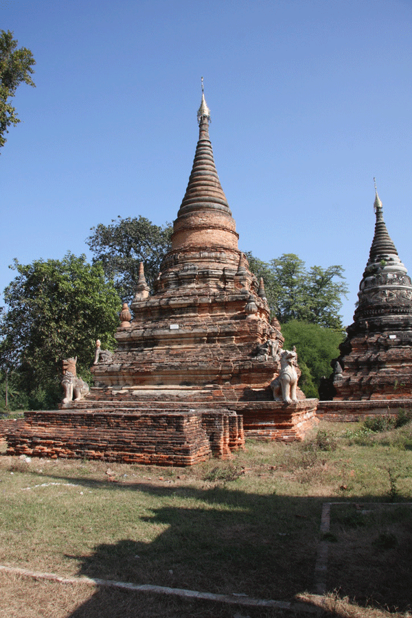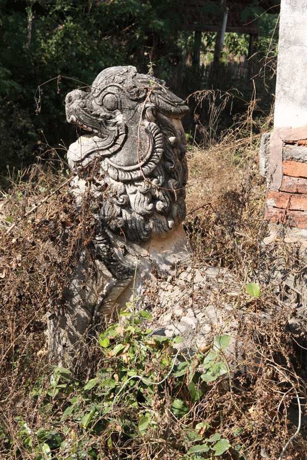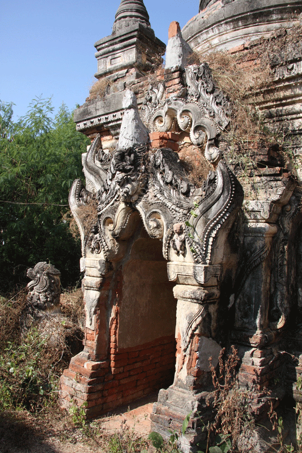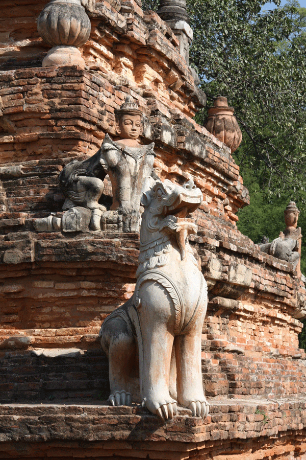 The ornate shrine of Daw Gyan Pagoda, Ava. The ornate shrine of Daw Gyan Pagoda complex with guardian statues of Chinthe leogryphs and carved patterns on the gate and cone of the building, Ava