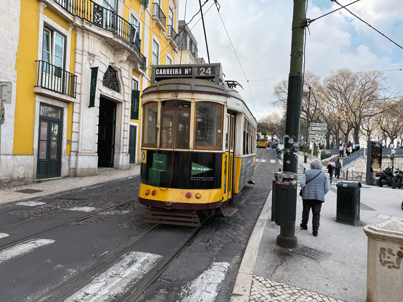 As our flight arrived early in Lisbon we had time to wander the streets sightseeing after checking into the Maxime Hotel. We crossed Praça da Alegria went along Rua de Glória, and then climbed up the steep slope that is Calcada de Gloria. This is the route of the Glória Funicular (popularly also known as Elevador da Glória) is a hybrid funicular-tram line. It connects the Pombaline downtown (at the Restauradores Square) with the Bairro Alto (São Pedro de Alcântara Garden). Along with the Elevador do Lavra and the Elevador da Bica it is one of three such funiculars in Lisbon.