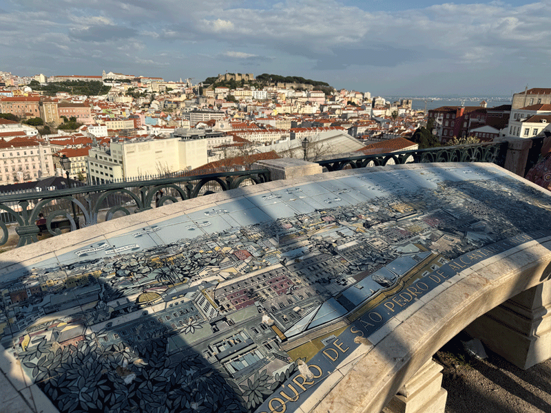 The Miradouro de São Pedro de Alcântara is one of the largest and most iconic observation points in Lisbon. It’s right next to the top of the Elevador da Glória and offers a special panorama of the city. From here you can see all of the Avenida da Liberdade, Restauradores and Baixa, besides the Castelo de São Jorge with its imposing walls and photogenic crown of green pine trees. You can also see in full detail the Miradouro da Igreja da Graça, with its imposing church. This viewing point is unusual in that it is part of a beautiful and well cared for garden where you can enjoy a refreshing drink at the kiosk. You’ll also find an original map made of azulejos to identify some of the iconic places you can see.