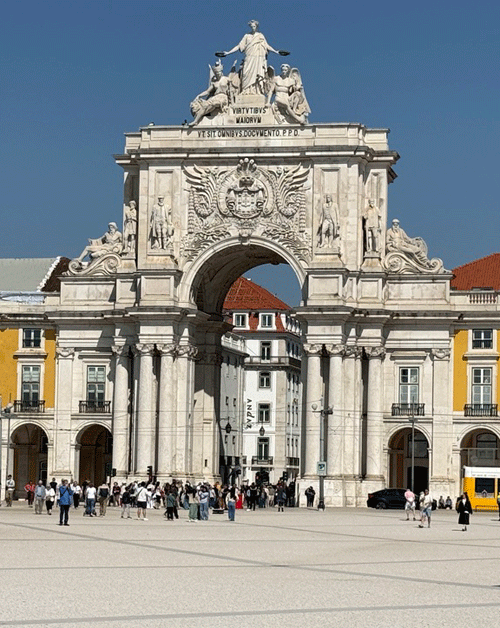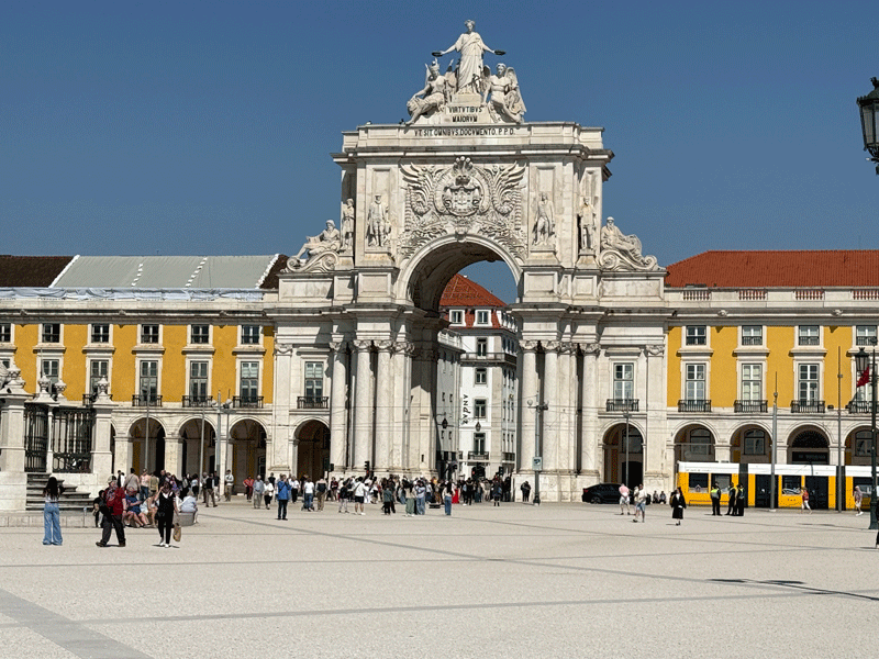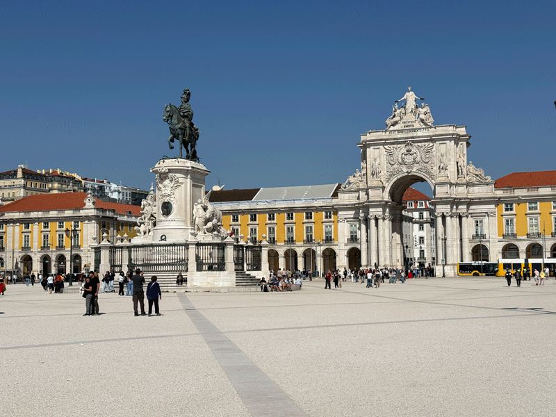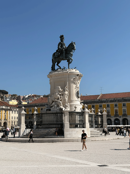 We continued walking towards the Tagus River and to Lisbon's most important square: the Praça do Comércio which was built on the site where the old Royal Palace used to exist before it was destroyed by the earthquake of 1755. It was for decades Lisbon's main entrepôt, and crucial for its maritime trade. The southern end of the plaza is open and looks out onto the Tagus River. The other three sides have yellow-colored buildings with arches all along the façade. When the square was first built, the commercial ships would unload their goods directly onto this square, as it was considered the “door” to Lisbon.