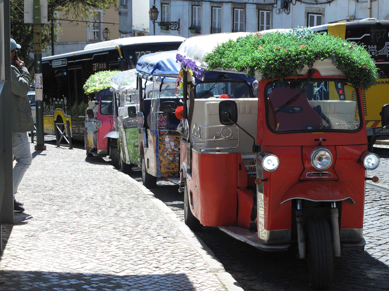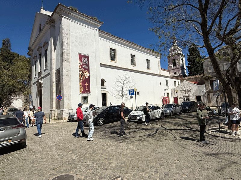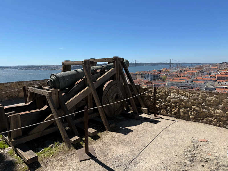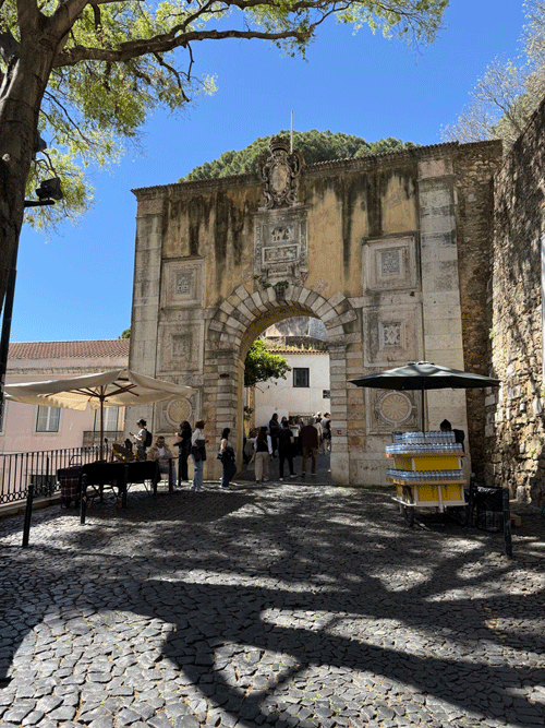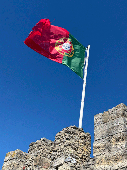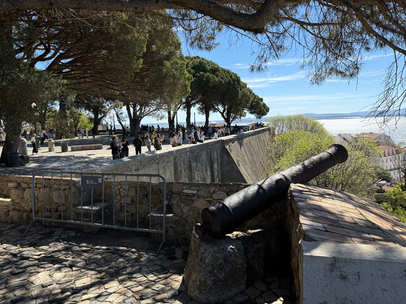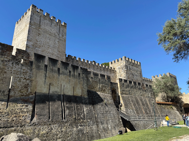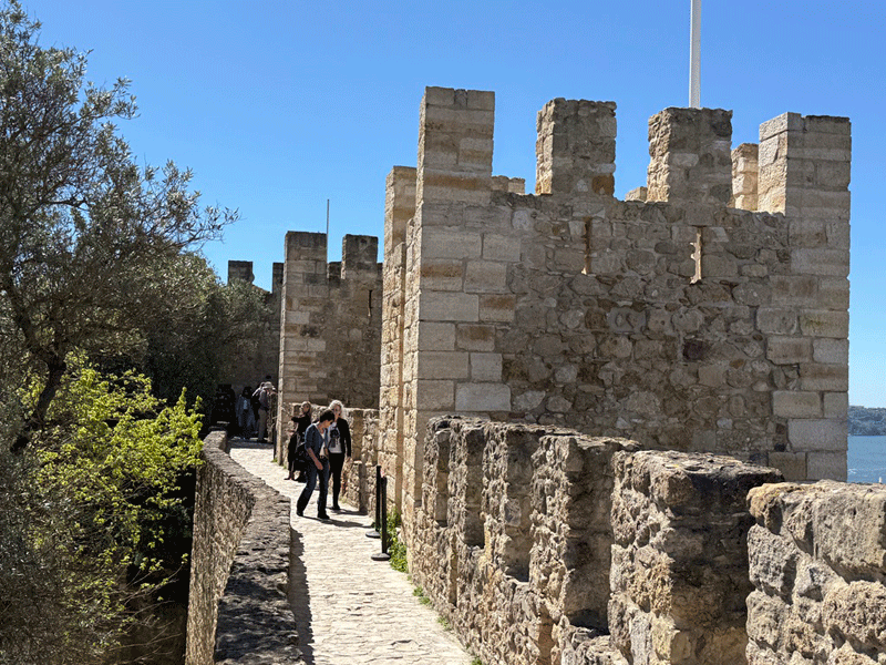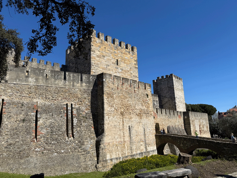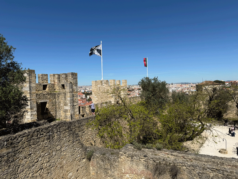 Today we visited Castelo de São Jorge. We walked down to the main square expecting to pick up Tram 28E, but unfortunately this tram stop had been temporarily suspended. The tram driver gesticulated that we should go further up the hill to another stop. We eventually found this stop, only to be met with a long queue for the tram. It was strange, as three trams were waiting to move on to this stop, but nothing was moving. It appears that the tram system does not have enough power, and at this time it was restricting the frequency of trams. I stuck my hand out to wave down a passing taxi, and fortunately it stopped. This saved us a long wait or the prospect of having to walk up the hill to the castle.