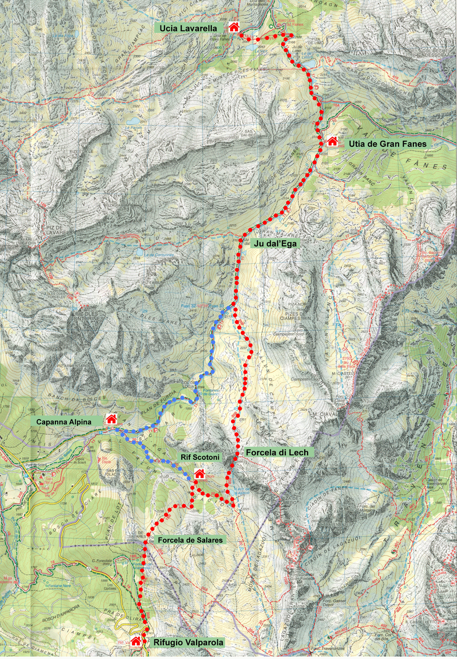 Although Colletts show the route from Ucia Lavarella to Rifugio Lagazuoi, the next stage is along the Setsas Line to Corvara, and since this starts at Rifugio Valparola it seems better to end Stage 4 theer. I have done Forcela di Lech / Rifugio Lagazuoi twice before, so the route to Rifugio Valparola would be breaking new ground. It also gives the opportunity to see Capanna Alpina nd Rifugio Scotoni. This route is outlined in blue below.