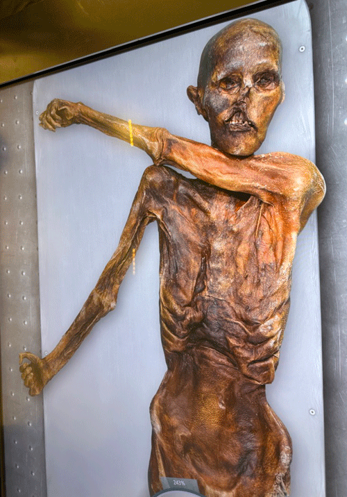 Over 5300 years ago, Ötzi was crossing Tisenjoch/Giogo di Tisa in the Schnalstal/Val Senales Valley, South Tyrol, where he was murdered and preserved naturally in the ice.