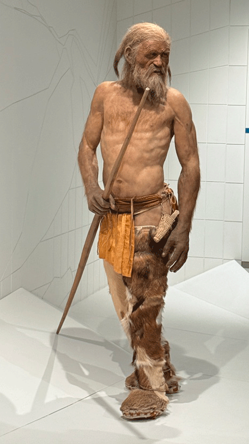 Ötzi is a glacier mummy from the Copper Age, who, thanks to extraordinary circumstances, has been preserved down to the present day. He was discovered accidentally by hikers in 1991, together with his clothing and equipment, on the Schnalstal/Val Senales Valley glacier.