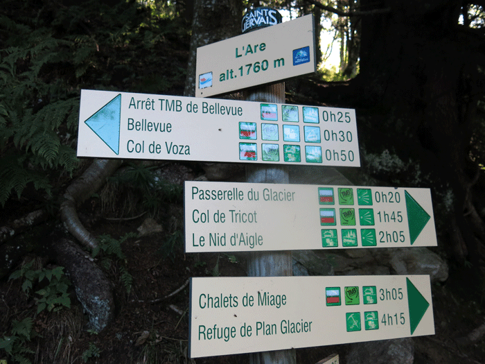 The hike from Les Houches at 1,010m to Col de Vosa at 1,653m is about 6 km and 650m of ascent; for those wanting to start the TMB on an easier footing there are three other ways of getting to Col de Vosa:-