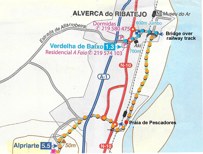Just after the derelict buildings above we came to a coffee shop at Praia de Pescadores, which is also where the boardwalk starts alongside and to the east of the railway line. The problem is that if you are staying in Verdelha de Baixo there is no way of crossing the railway line until you get to Alverca station, and then you have a 1.3 km walk back to Verdelha de Baixo..... not what you want at the end of a long walk.