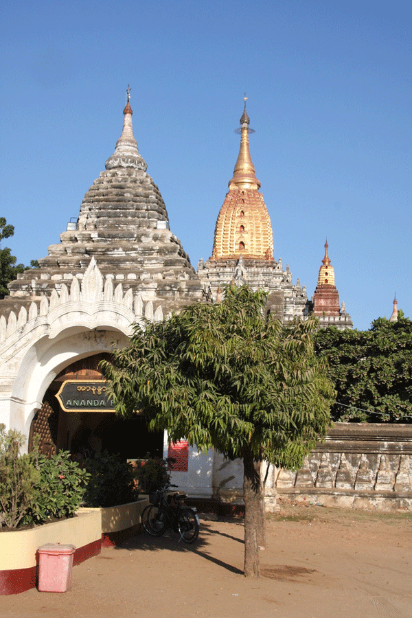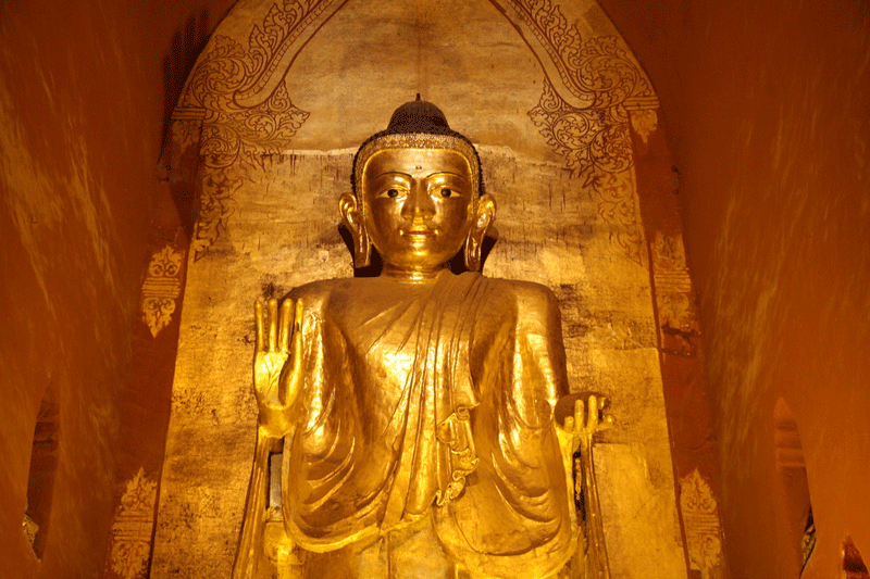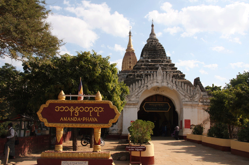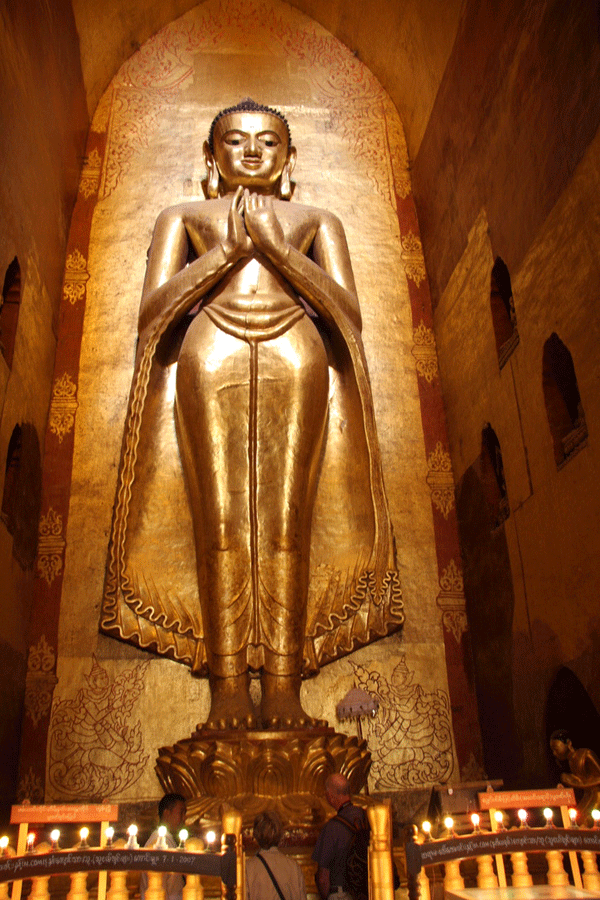 Built by Kyanzittha in 1091 A.D., Ananda Temple is one of the finest and most venerated temples in Bagan. It consists of a square plan with 200 foot sides, broken on each side by a large vestibule. The inside consists of two high vaulted narrow passages running parallel to each other along the four sides. Central niches on each of the four sides contain huge Buddha images, two of which are original and the other two are later replicas.