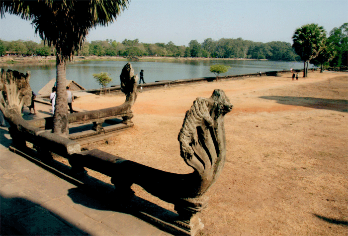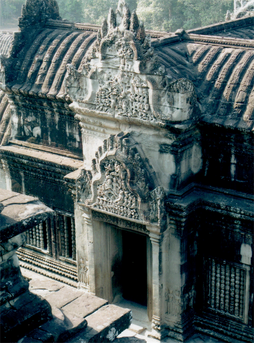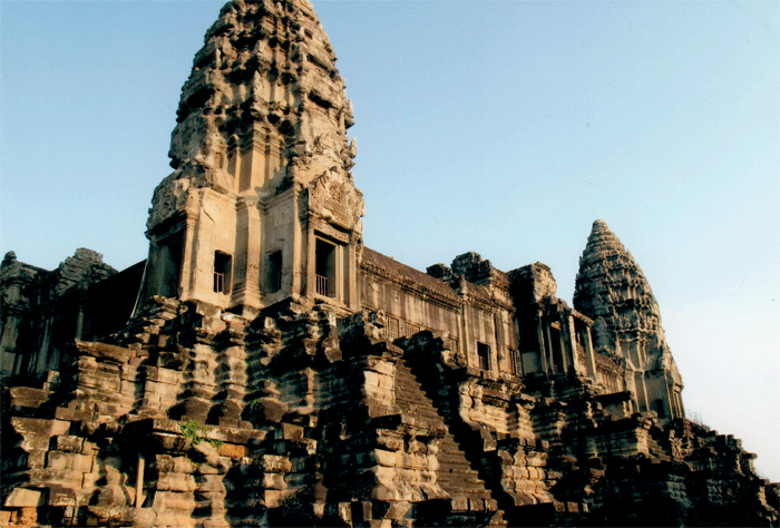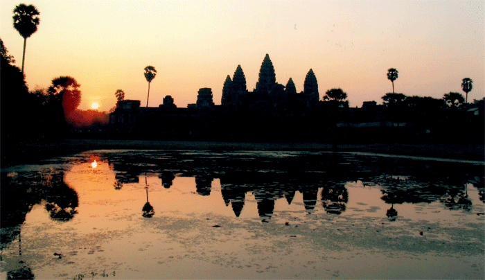 Angkor Wat  is a Theravada Buddhist temple complex and the largest religious complex in the world. Located on a site measuring over 400 acres within the ancient capital of Angkor, it was constructed between 1113 and 1150 CE during the reign of the Khmer king Suryavarman II as a Hindu temple dedicated to Vishnu. From the late 13th century onward, the complex was gradually transformed into a Buddhist temple and has remained an active center of Buddhist worship for centuries. Angkor Wat is noted for its monumental scale, extensive bas-reliefs, and architectural unity characteristic of Khmer architecture, and unlike most Angkorian temples it is oriented toward the west. It is a national symbol of Cambodia and appears on the Cambodian national flag.