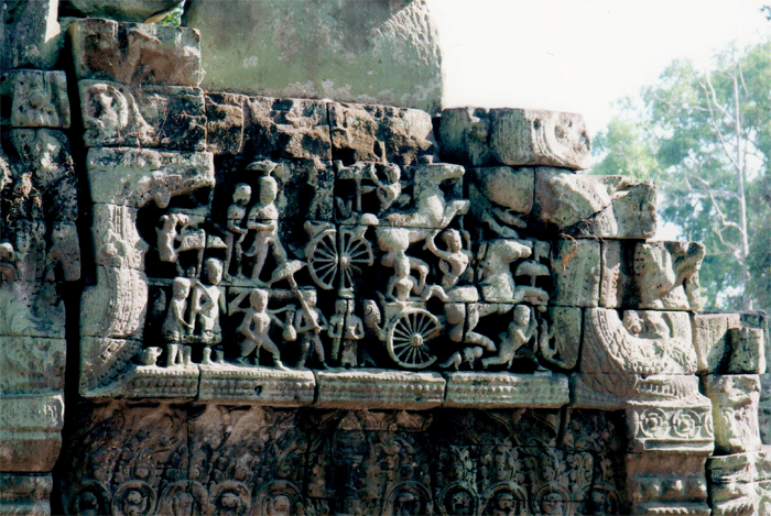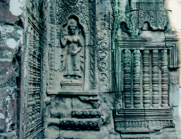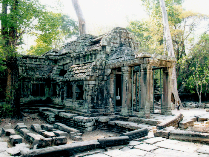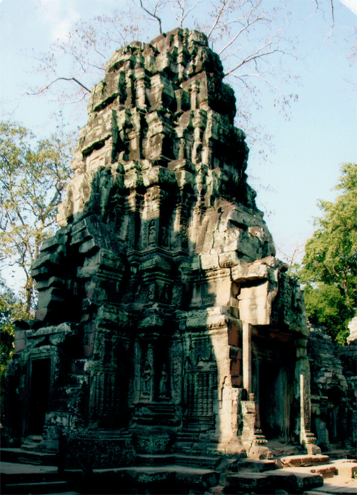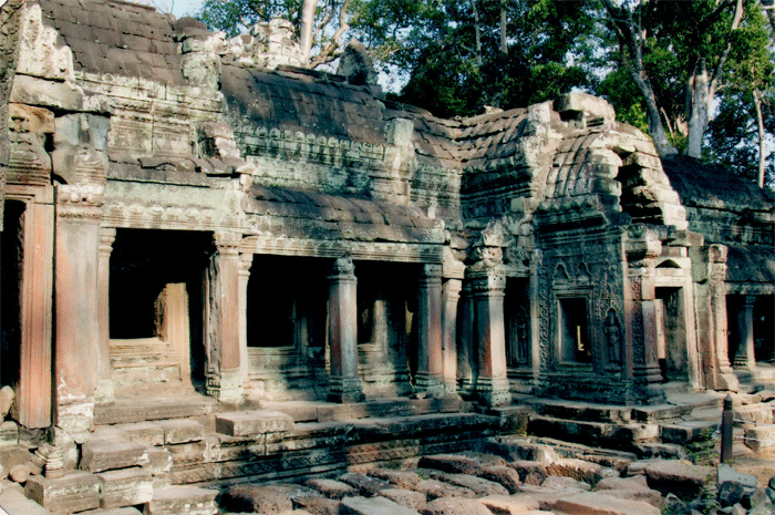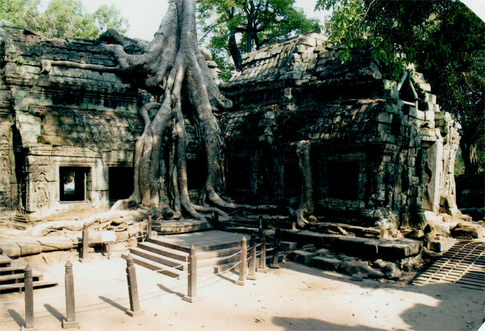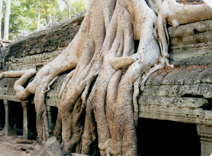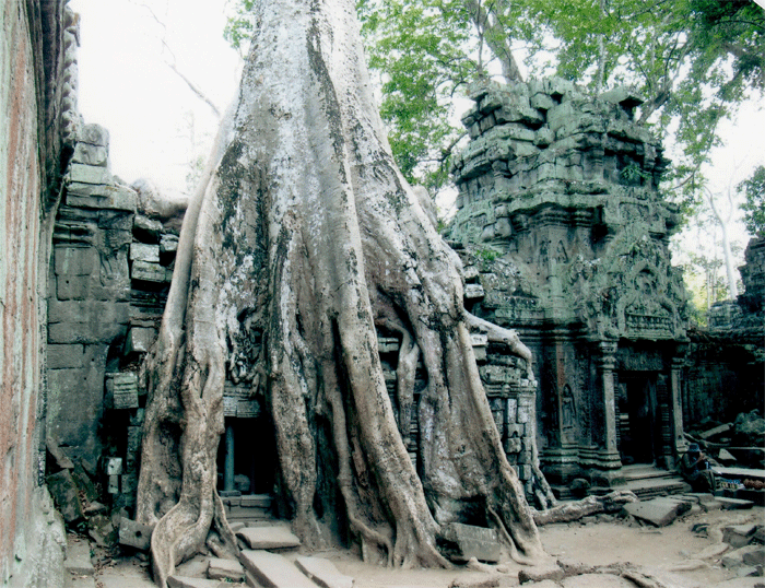 The so-called 'Tomb Raider Temple', Ta Prohm is cloaked in dappled shadow, its crumbling towers and walls locked in the slow muscular embrace of vast root systems. Undoubtedly the most atmospheric ruin at Angkor,