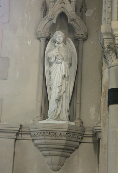 Two angels carved by Robert Edward Cecil Fouracre Glassby (1872-1908) sit in recesses behind the altar and on either side of the stained glass window in the Battenberg chapel.